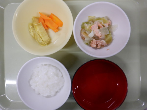 離乳食は 全粥 うわずみ 鮭と野菜の煮物(鮭、玉ねぎ、キャベツ、じゃが芋) スティック野菜(さつま芋、人参) です。