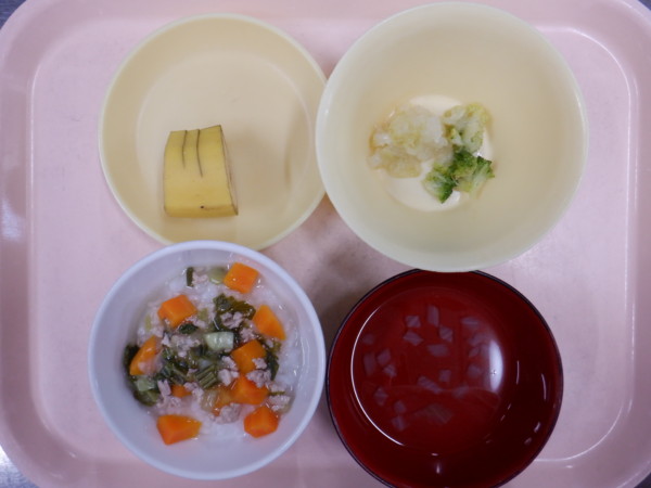 離乳食は あんかけ粥(カレイ、人参、玉ねぎ、チンゲン菜 うわずみ(玉ねぎ) お浸し(ブロッコリー、白菜) フルーツ(バナナ)です。