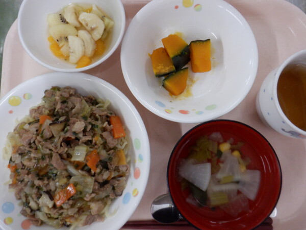 今日の給食は、あんかけ焼きそば かぼちゃの甘煮 中華スープ フルーツポンチ です。離乳食は、豚そぼろ粥(豚ひき肉 人参 小松菜) うわずみ(白菜) かぼちゃの甘煮(かぼちゃ じゃがいも) フルーツ(バナナ) です。