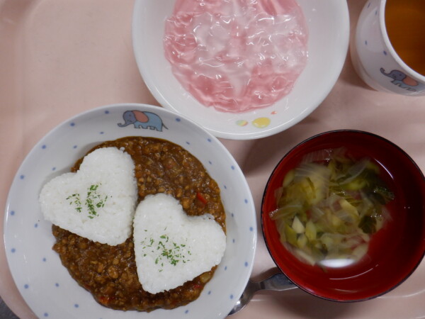 今日の給食は ドライカレー(ハートごはん) 季節のスープ キラキラゼリー です。