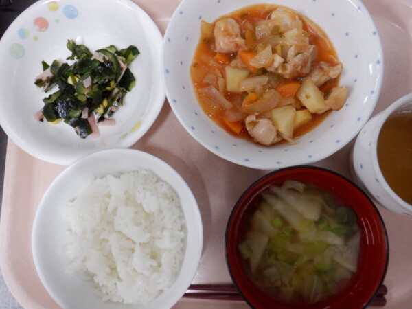 今日の給食は、ごはん 酢鶏 きゅうりとコーンの和え物 中華スープ です。離乳食は、全粥 うわずみ(大根) 鶏肉と野菜の煮物(鶏もも肉 人参 じゃが芋 玉ねぎ) キャベツの和え物(キャベツ ほうれん草) です。