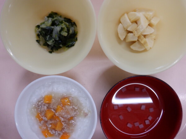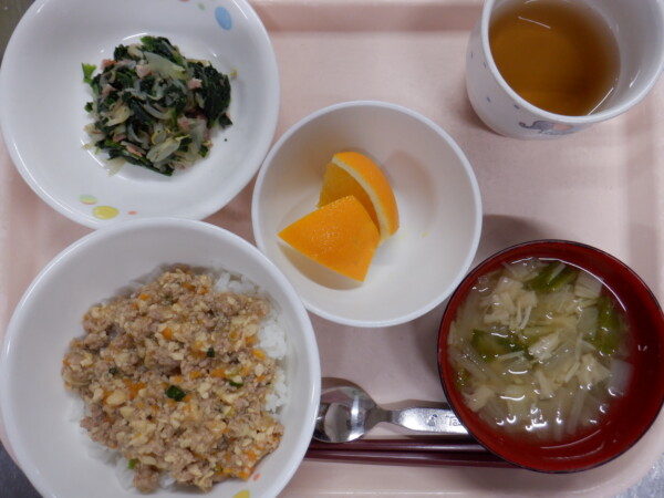 今日の給食は、大豆そぼろかけごはん ほうれん草のバターソテー みそ汁 フルーツ(オレンジ) です。離乳食は、そぼろかけ粥 うわずみ(大根) ほうれん草の煮浸し フルーツ(バナナ) です。