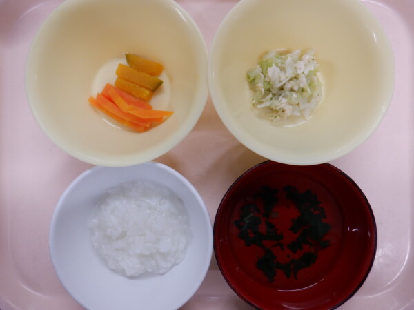 離乳食は、 全粥 うわずみ(小松菜) 鶏肉とキャベツの旨煮(鶏肉、キャベツ、玉ねぎ、ブロッコリー) スティック野菜(人参、かぼちゃ) です。