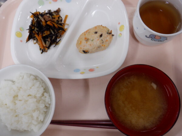 今日の給食は、 ごはん 鶏つくね焼き ひじきの炒り煮 みそ汁 です。