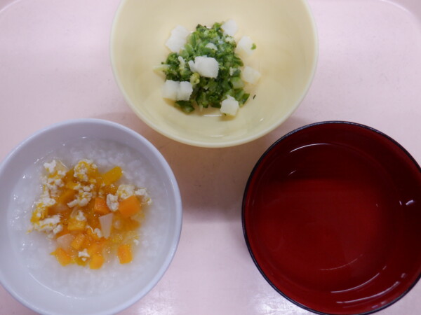 離乳食は、 ガパオライス風(全粥、鶏ひき肉、人参、玉ねぎ、かぼちゃ) ブロッコリーサラダ(ブロッコリー、キャベツ、じゃが芋) です。