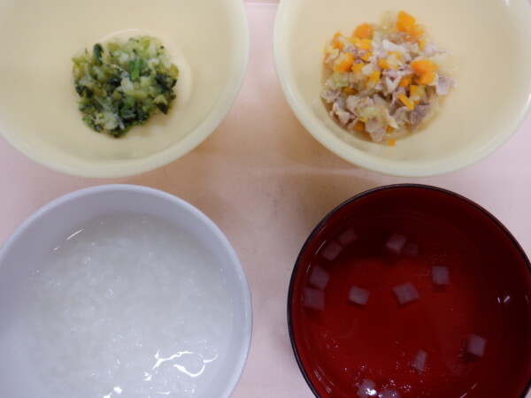今日の給食は、 ごはん 豚肉と白菜のあんかけ ひじきのごま和え みそ汁 です。離乳食は、 全粥 うわずみ(大根) 豚肉と白菜のあんかけ(豚肉、白菜、人参) 煮浸し(小松菜、キャベツ) です。