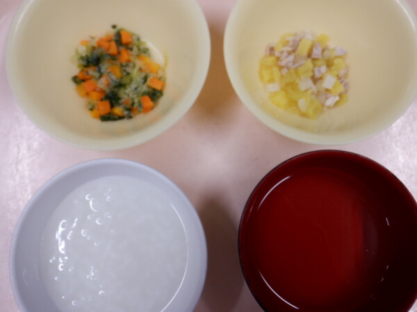 今日の給食は、ごはん 鶏肉のマーマレード焼き サラスパソテー 野菜スープ です。離乳食は、全粥 うわずみ 鶏肉と大根の煮物(鶏肉 大根 さつまいも) 野菜ソテー(キャベツ 人参 チンゲン菜) です。