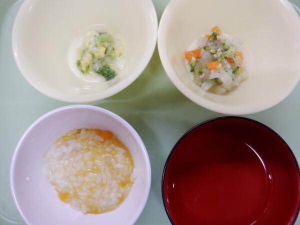 離乳食は、 彩り粥(全粥、かぼちゃ、玉ねぎ) 五目煮風(豚ひき肉、人参、大根、ブロッコリー、キャベツ) 煮びたし(白菜、チンゲン菜) です。