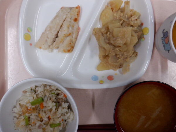 今日の給食は、 秋の彩ごはん 赤魚の麹焼き 五目煮 みそ汁 です。