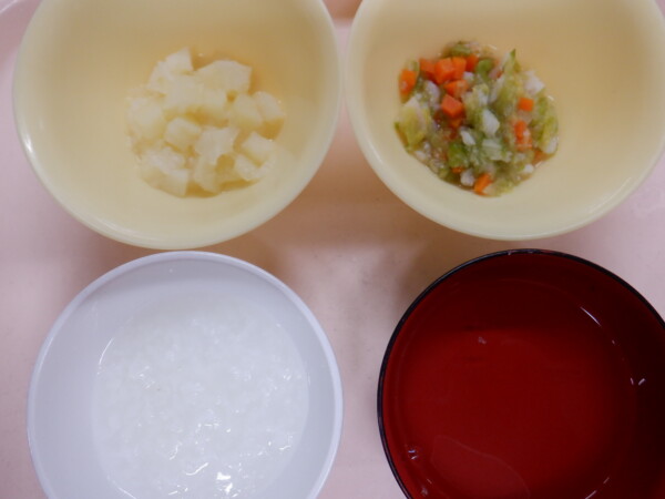 離乳食は、 全粥 うわずみ タラと野菜の煮物(タラ、白菜、人参) ジャーマンポテト風(じゃが芋、玉ねぎ) です。