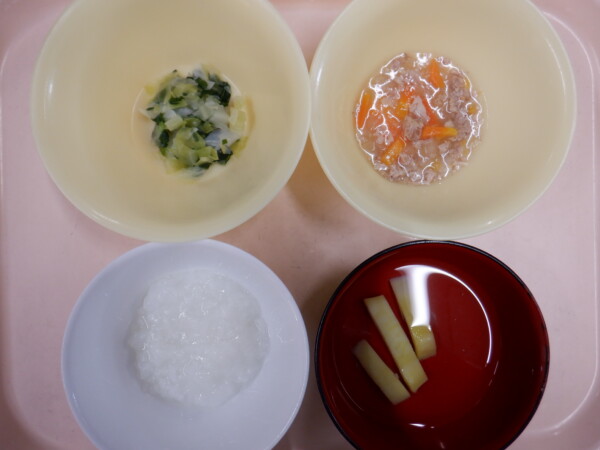 離乳食は、 全粥 うわずみ(さつまいも) 豚玉煮(豚肉、玉ねぎ、人参) 野菜サラダ(キャベツ、小松菜) です。