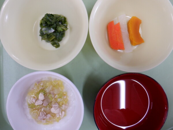離乳食は、 鶏あんかけ粥(全粥、鶏もも肉、玉ねぎ、白菜) うわずみ 煮浸し(キャベツ、チンゲン菜) 野菜スティック(かぼちゃ、大根、人参) です。