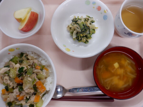 今日の給食は、 鶏あんかけ丼 小松菜のごま和え みそ汁 フルーツ(りんご) です。