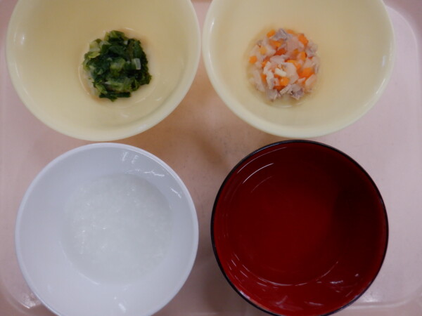 離乳食は、 全粥 うわずみ 豚肉と野菜の煮物(豚肩肉、人参、玉ねぎ、じゃがいも) お浸し(白菜、チンゲン菜) です。