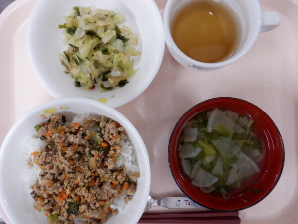 今日の給食は、 そぼろ丼 野菜のおかか和え 七草汁 です。
