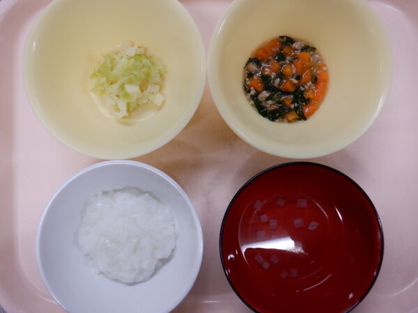 離乳食は、 全粥 うわずみ(大根) 豚そぼろあんかけ(豚ひき肉、人参、小松菜) キャベツの和え物(キャベツ、じゃが芋) です。
