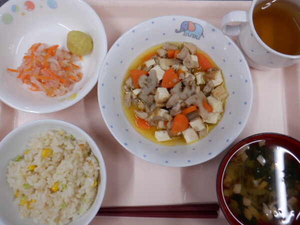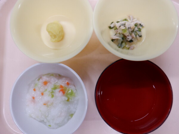 今日の給食は、 彩りごはん 筑前煮 いもきんとん 紅白なます すまし汁 です。離乳食は、 彩り粥(全粥、人参、キャベツ) うわずみ 鶏肉と野菜の煮物(鶏もも肉、白菜、玉ねぎ、小松菜) いもきんとん(さつまいも) です。