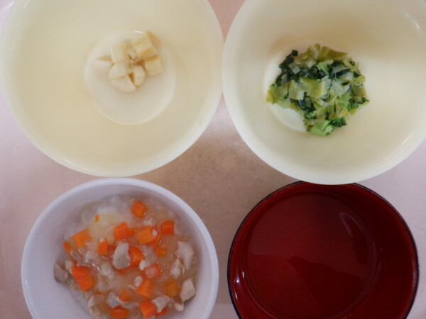 離乳食は、 鶏あんかけ粥(全粥、玉ねぎ、じゃが芋) うわずみ 野菜サラダ(キャベツ、小松菜) フルーツ(バナナ) です。