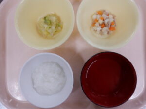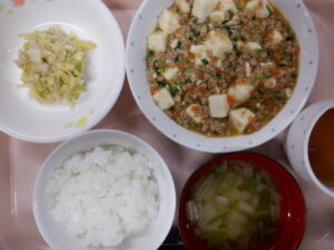 今日の給食は、ごはん ふんわり麻婆豆腐 キャベツナムル じゃが玉スープ 麦茶 です。離乳食は、全粥 うわずみ ひき肉の煮物(豚ひき肉 人参 じゃがいも 大根) キャベツの和え物(キャベツ ブロッコリー 玉ねぎ) です。
