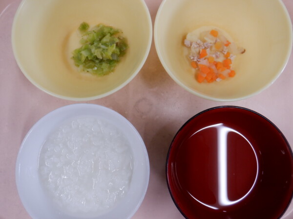 離乳食は、 全粥 うわずみ 鶏肉と野菜の煮物(鶏もも肉、じゃが芋、玉ねぎ、人参) 煮浸し(キャベツ、ブロッコリー、大根) です。