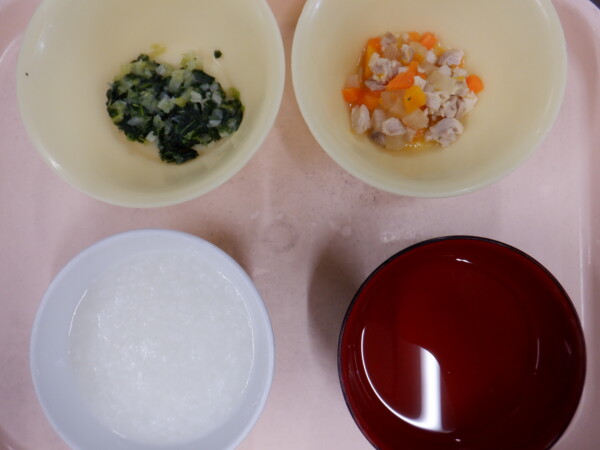 離乳食は、 全粥 うわずみ 鶏肉の煮物(鶏肉、人参、かぼちゃ、大根) 野菜の煮浸し(キャベツ、小松菜) です。