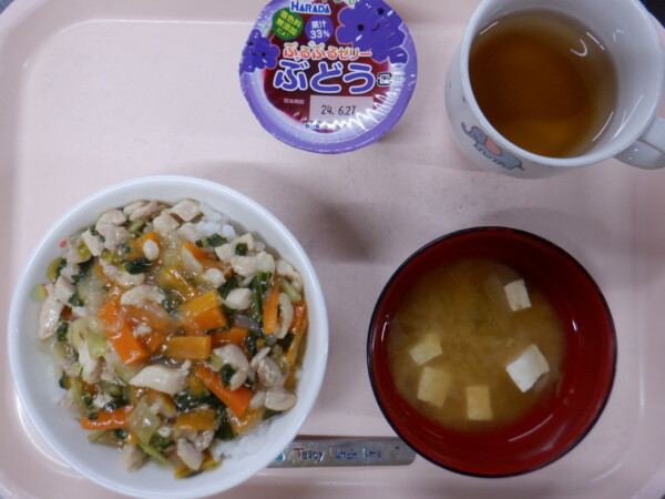 今日の給食は、 鶏肉と野菜のあんかけ丼 みそ汁 ゼリー です。