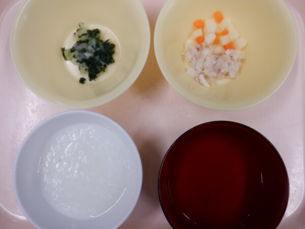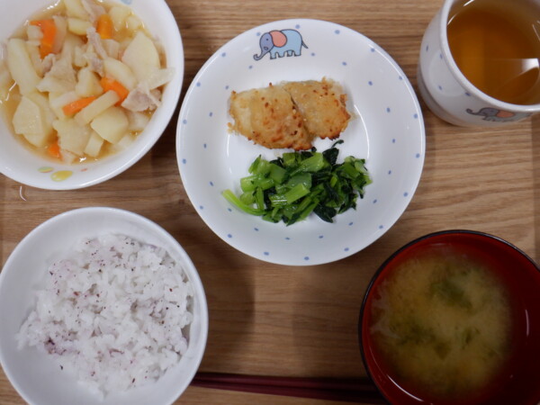 今日の給食は、ゆかりごはん タラのごま風味焼き 付け合わせ(小松菜) 豚ばらとじゃが芋の旨煮 なめこ汁 です。離乳食は、全粥 うわずみ 白身魚の旨煮(タラ 人参 じゃがいも) お浸し(小松菜 玉ねぎ 大根) です。
