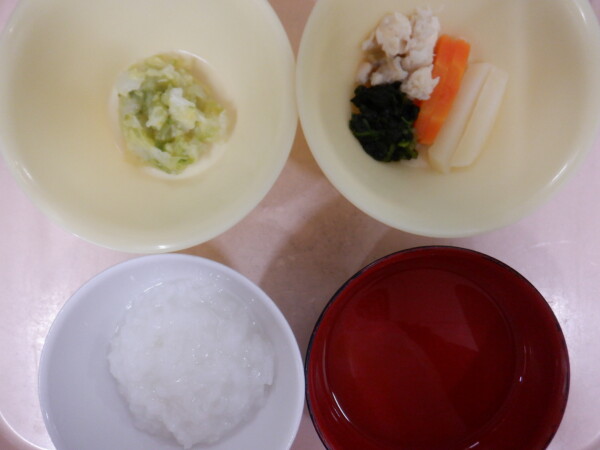 離乳食は、 全粥 うわずみ 魚と野菜の煮物(カレイ、ほうれん草、じゃが芋、人参) 煮浸し(白菜、キャベツ) です。