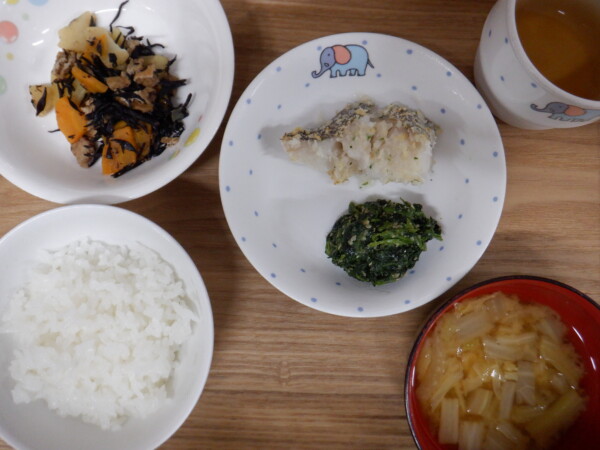 今日の給食は、 ごはん ホキのチーズパン粉焼き 付け合せ(ほうれん草) ひじきの煮物 みそ汁 です。
