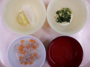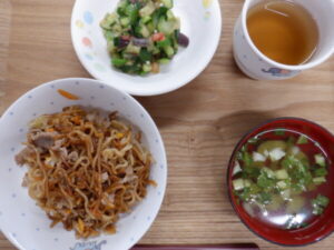 今日の給食は、焼きそば 夏のねばねばサラダ 野菜スープ です。