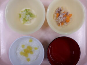 離乳食は、さつま芋粥 うわずみ 豚肉と根菜の煮物(豚肉 人参 大根) キャベツの和え物(キャベツ 玉ねぎ) です。