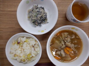 今日の給食は、さつま芋ごはん キャベツとひじきの白和え 豚汁 です。