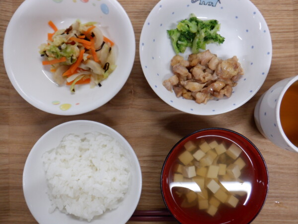 今日の給食は、 ごはん 鶏肉のみそ漬け焼き 野菜の塩昆布和え すまし汁 です。