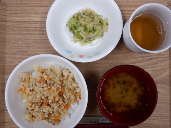 今日の給食は、 鶏そぼろ丼 キャベツのナムル みそ汁 です。