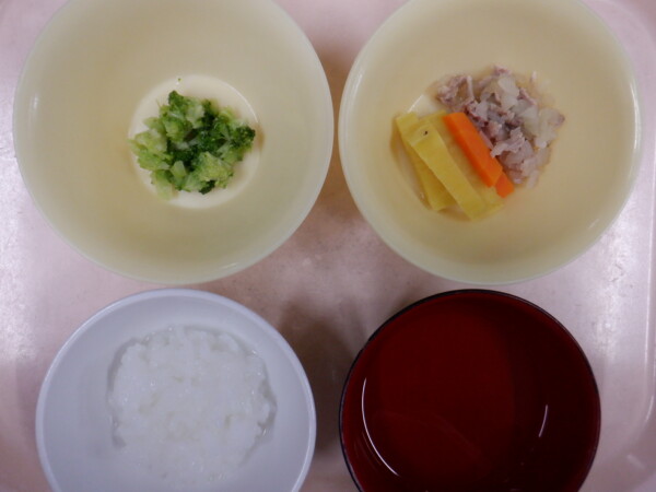 離乳食は、 全粥 うわずみ さつま芋の甘煮風(豚肉、さつまいも、人参、玉ねぎ) 煮浸し(ブロッコリー) です。