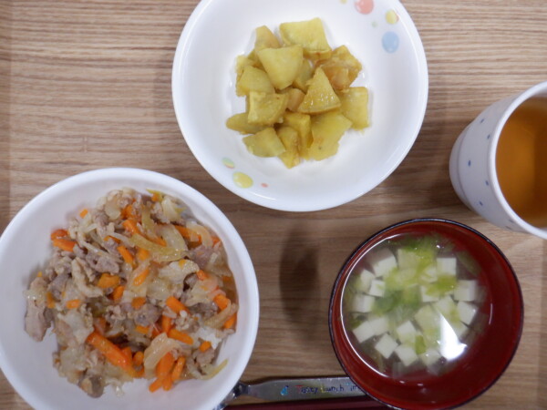 今日の給食は、 豚丼 さつま芋の甘煮 豆腐スープ です。