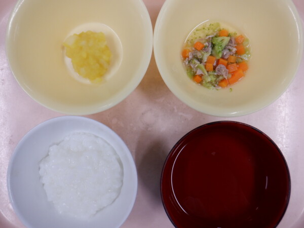 離乳食は、 全粥 うわずみ 野菜のそぼろ煮(豚肉、人参、ブロッコリー) さつま芋のマッシュ(さつま芋、玉ねぎ) です。