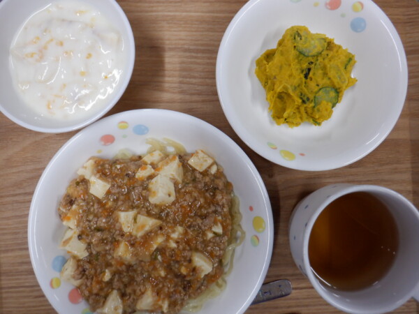 今日の給食は、 マーボー麵 かぼちゃサラダ フルーツヨーグルト です。