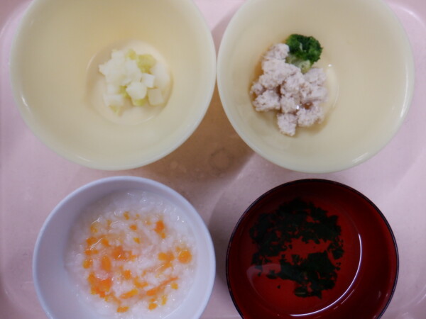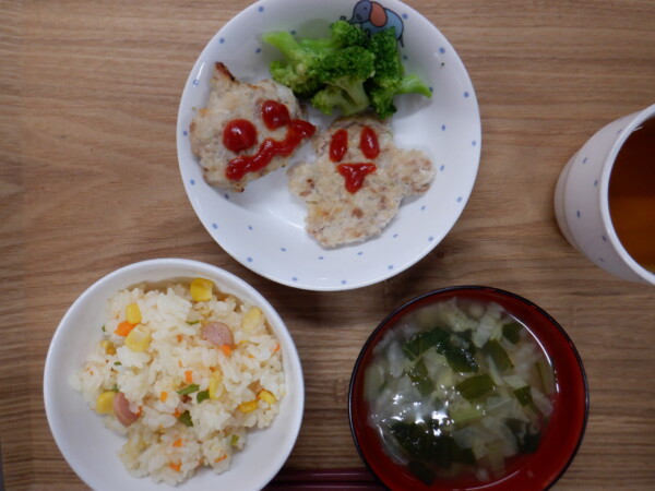 今日の給食は、ピラフ ハロウィンハンバーグ 付け合わせ(ブロッコリー) 具だくさんスープ です。離乳食は、ピラフ粥(全粥 人参 大根) うわずみ(小松菜) ハンバーグ(ひき肉 玉ねぎ ブロッコリー) じゃが芋のスープ煮(じゃが芋 白菜) です。