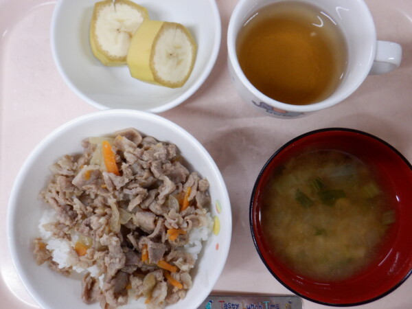 今日の給食は、 豚玉丼 みそ汁 フルーツ(バナナ) です。