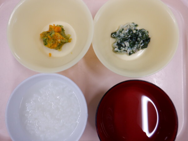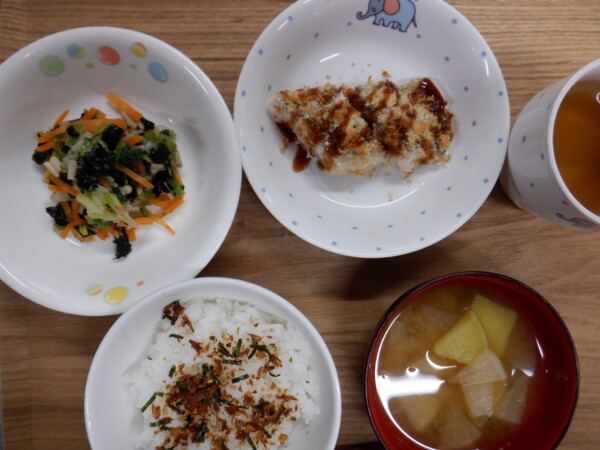 今日の給食は、おかかごはん 白身魚のフライ 小松菜の海苔和え みそ汁 です。離乳食は、全粥 うわずみ 魚と野菜の煮物(カレイ 小松菜) 野菜の和え物(白菜 かぼちゃ) です。