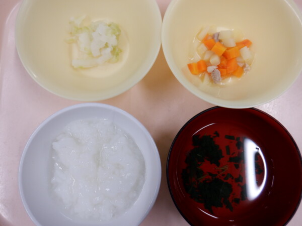 今日の給食は、カレーうどん 大根サラダ フルーツ(りんご) です。離乳食は、全粥 うわずみ(小松菜) 鶏と根菜の煮物(鶏肉 人参 じゃが芋 玉ねぎ) 大根サラダ(大根 キャベツ) です。