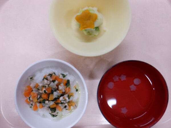 離乳食は、 彩り粥(全粥、人参、小松菜、鶏肉) うわずみ(大根) カラフルサラダ(じゃが芋、ブロッコリー、かぼちゃ) です。