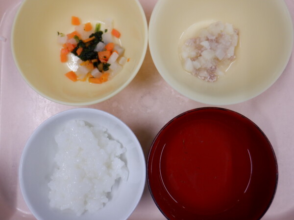離乳食は、 全粥 うわずみ ひき肉と野菜の煮物(豚ひき肉、じゃがいも、玉ねぎ) お浸し(人参、大根、ほうれん草) です。