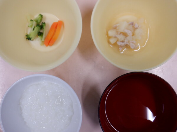 離乳食は、 全粥 うわずみ 鶏じゃが(鶏肉、じゃが芋、玉ねぎ) スティック野菜(人参、ブロッコリー) です。