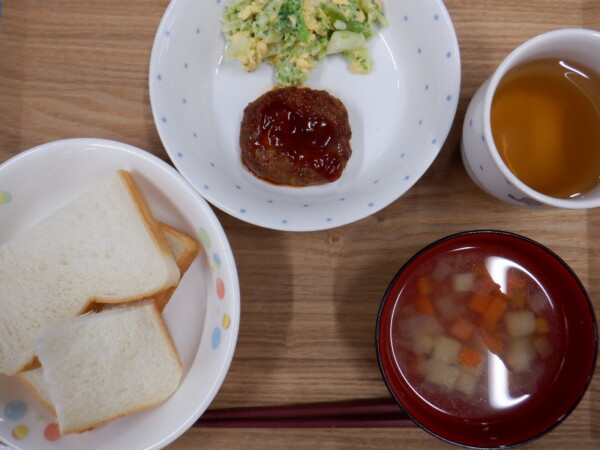 今日の給食は、 食パン 煮込みハンバーグ ブロッコリーのサラダ ポテコロスープ です。