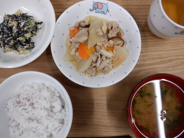 今日の給食は、 ゆかりごはん 鶏大根 ひじきの白和え すまし汁 です。