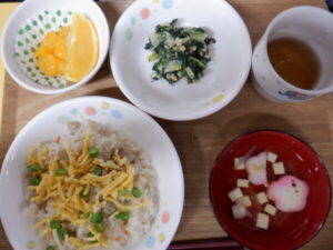 今日の給食は、醬油ラーメン ポテトのチーズ焼き 杏仁フルーツ です。