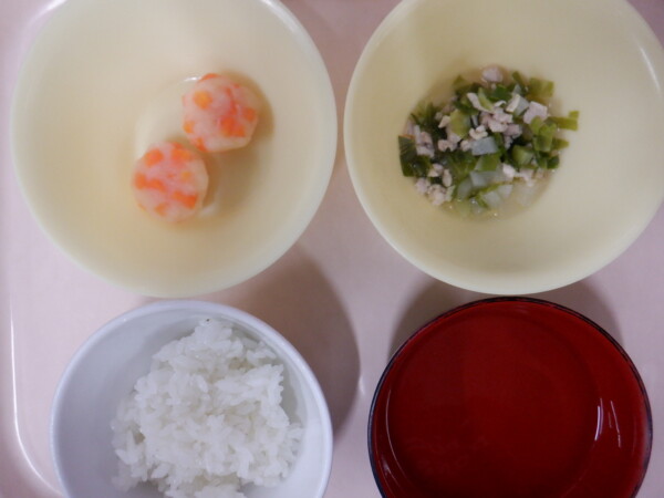 離乳食は、 米飯 うわずみ 鶏肉の中華風(鶏肉、キャベツ、大根) いもコロッケ(じゃが芋、人参) です。