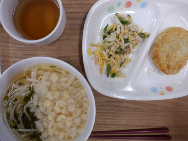 今日の給食は、 かけうどん かぼちゃコロッケ バンバンジー です。